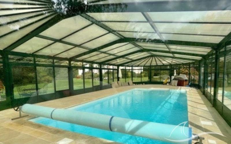 À l’extérieur, un parc paysager clos de 1,65 hectare mêle allées, parterres fleuris et arbres centenaires, offrant une atmosphère de paix absolue. Une piscine de 11 x 5 m, abritée par une élégante verrière esprit jardin d’hiver, complète cet environnement enchanteur.