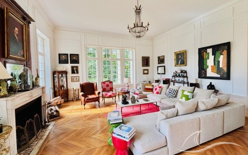 Édifiée en moellons de grès et briques, coiffée d’ardoises, la demeure déploie environ 700 m² sur trois niveaux. Les réceptions majestueuses (grands salons, bureau en rotonde, salle à manger ouvrant sur le parc) allient volumes, lumière et raffinement (parquets point de Hongrie, cheminées de marbre, hauteur sous plafond 4 m).
