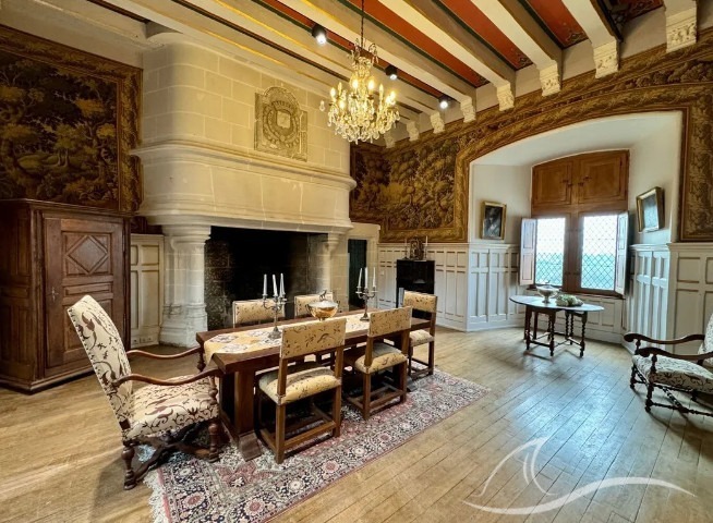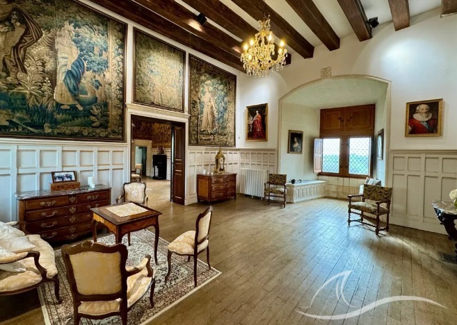 Ce château, inscrit aux Monuments Historiques, conserve de nombreux éléments d’époque : cheminées monumentales, parquets anciens, tapisseries et plafonds de plus de 4 mètres de hauteur.