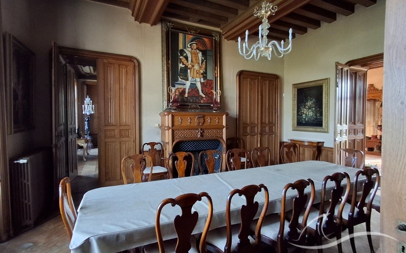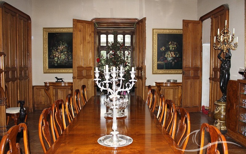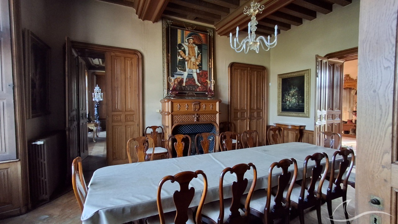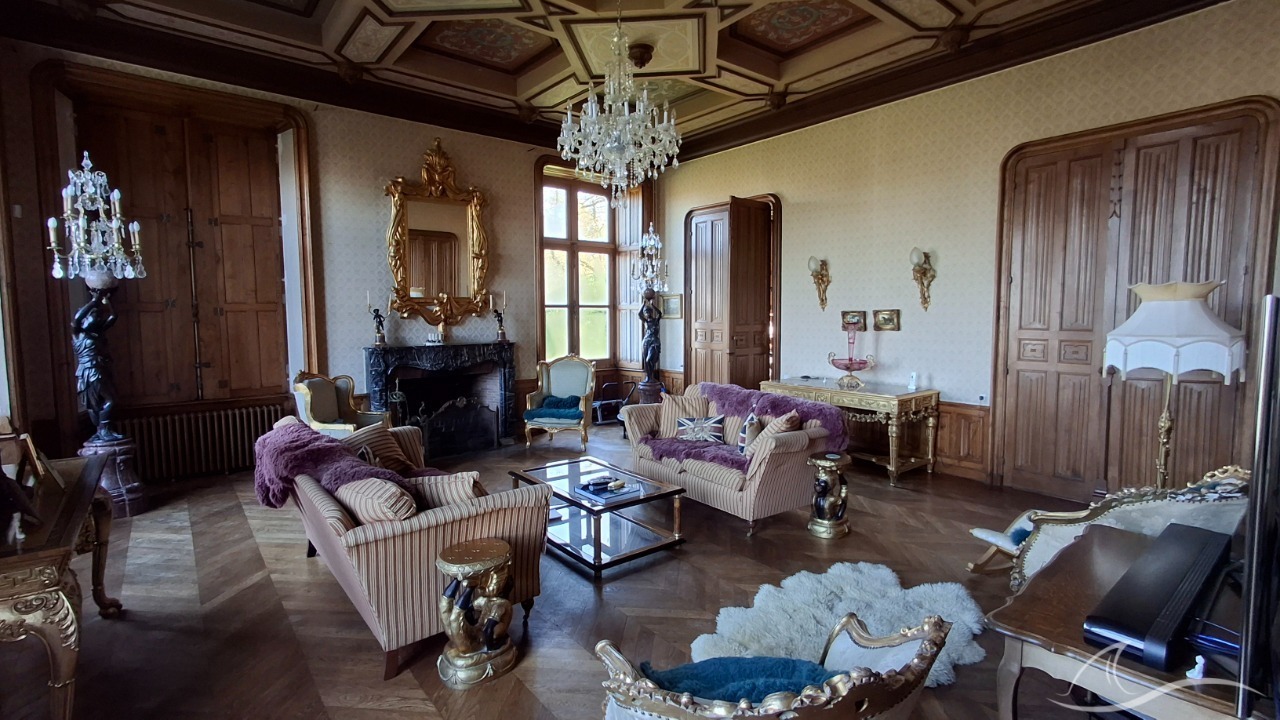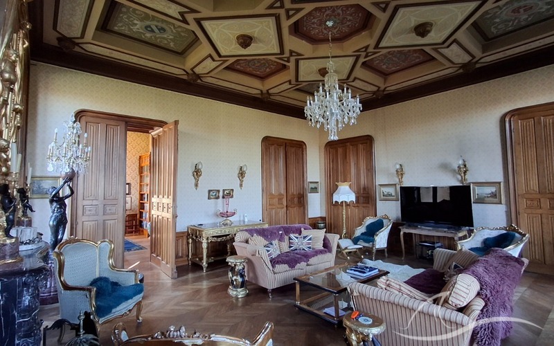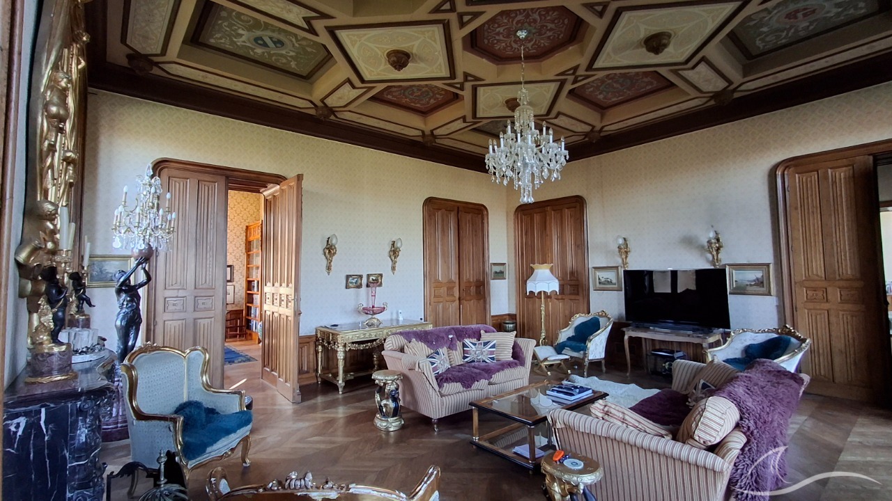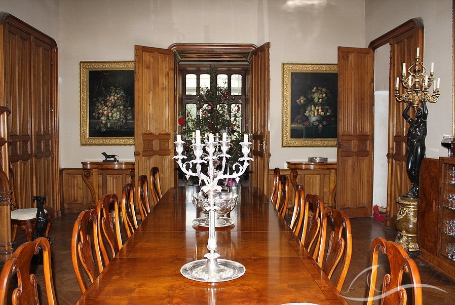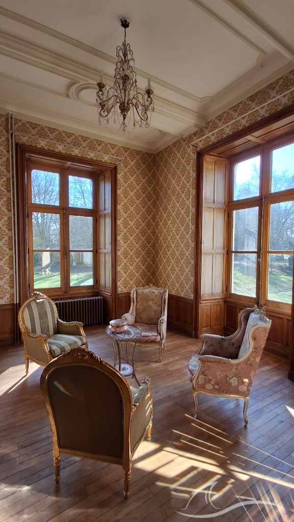 Au rez-de-chaussée surélevé auquel on accède par un joli perron : un grande entrée (53 m²) avec départ d' escalier en bois, bureau (28 m²), grand salon (50 m²), bibliothèque (23 m²), salle à manger (39 m²), petite cuisine installée dans l' ancien office, petite salle à manger (25 m²), cabinet de toilette, escalier de service.