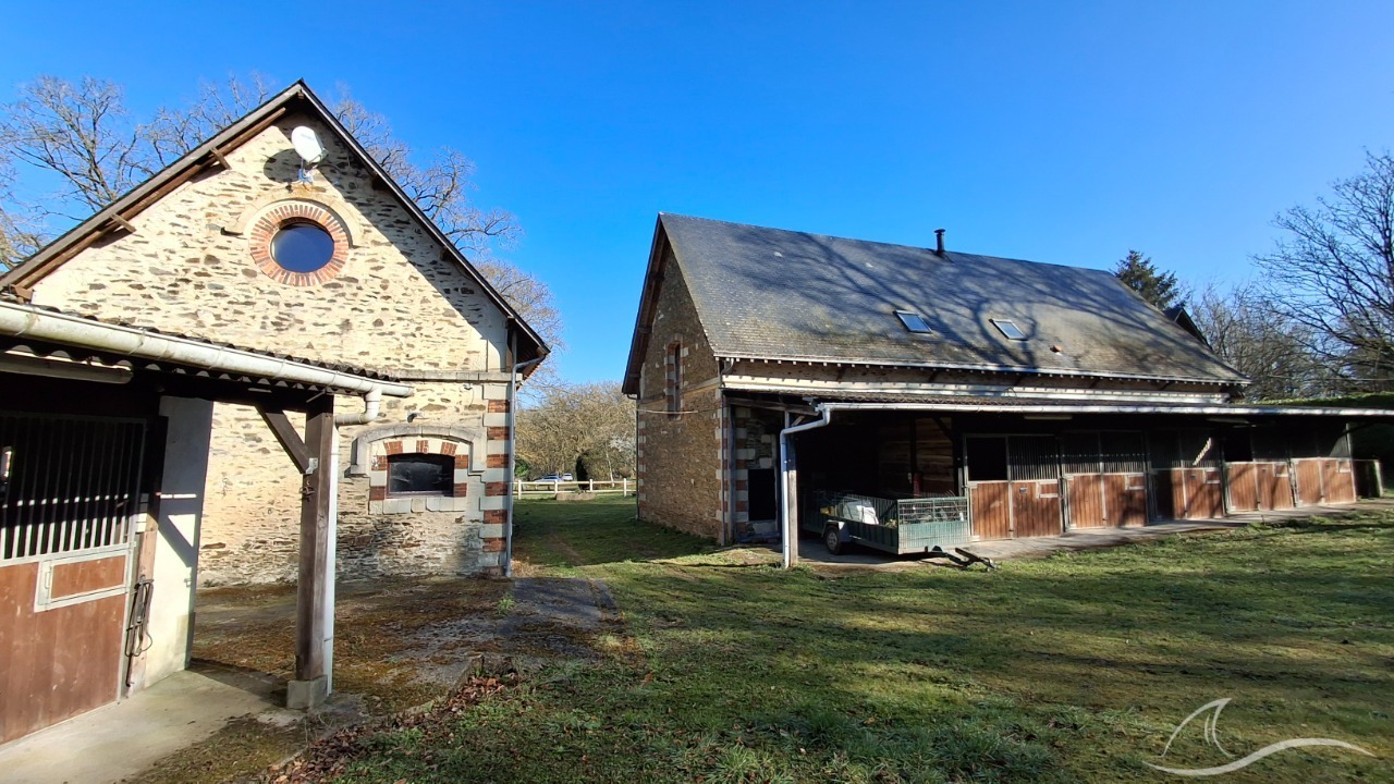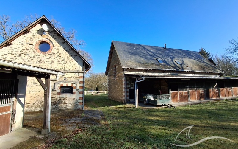 A l' Ouest : un bâtiment qui abrite un confortable appartement avec salle de séjour, cuisine, deux chambres, deux salles de bains. Sellerie et boxes à chevaux.