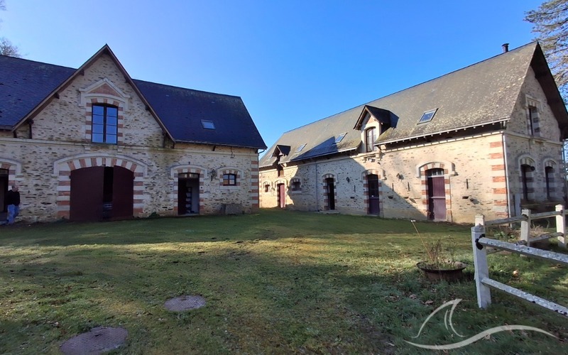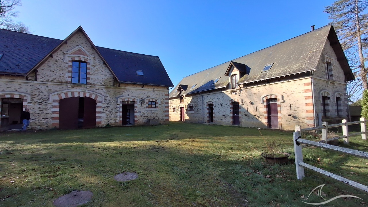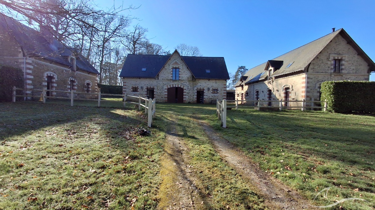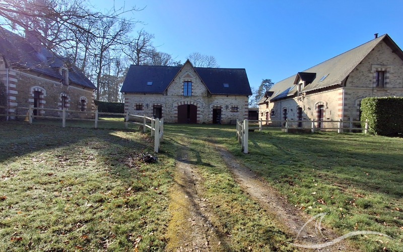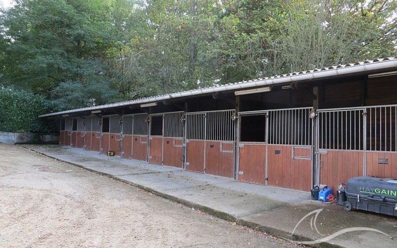 A l' Est : une ancienne maison d'habitation de trois pièces. Au centre : un beau bâtiment qui abrite un confortable logement avec cuisine, w-c et à l'étage : superbe loft. Garage et remise. A l' arrière : 17 boxes à chevaux.