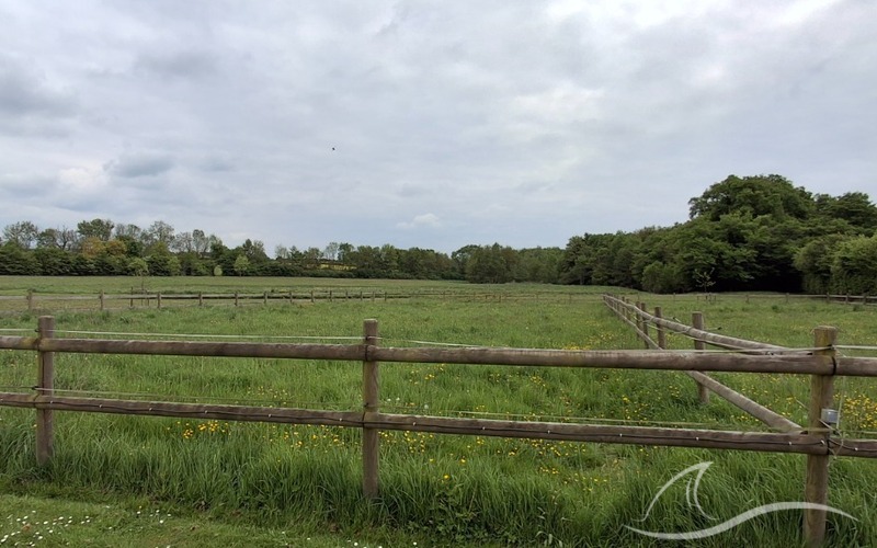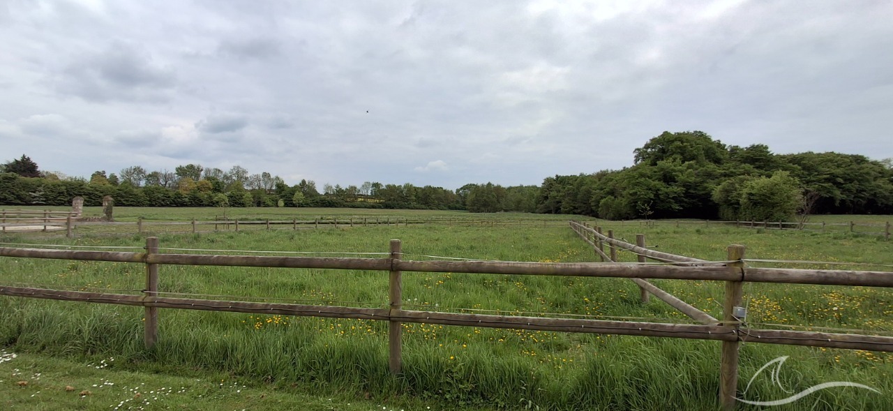 Les dépendances accueillent des infrastructures équestres (manège, paddocks en bois, espaces de détente)