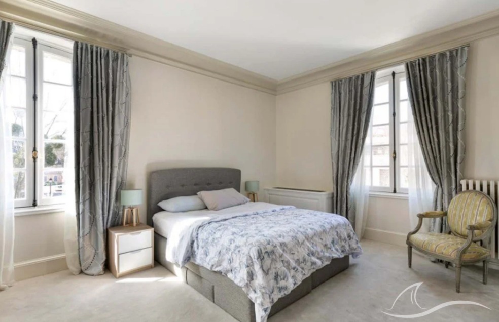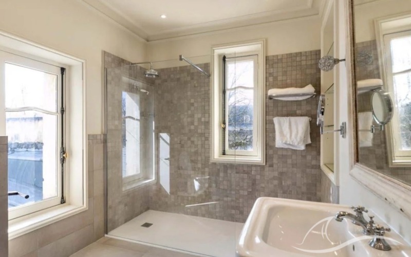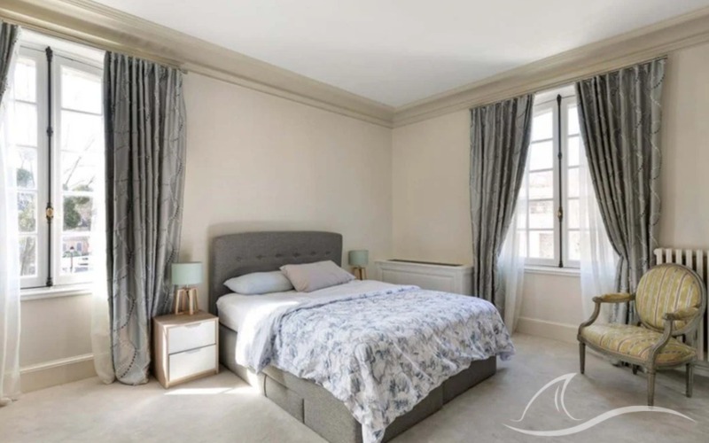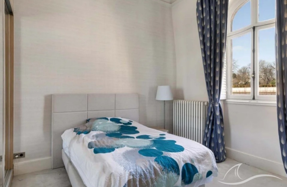 Le pavillon Ouest, entièrement restauré (environ 410 m²), se distingue par ses vastes pièces de réception baignées de lumière et ses quatre suites à l’étage, chacune avec salle de bains.