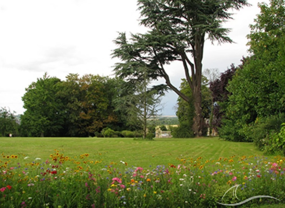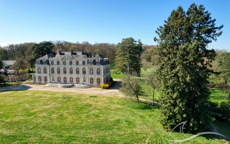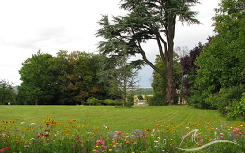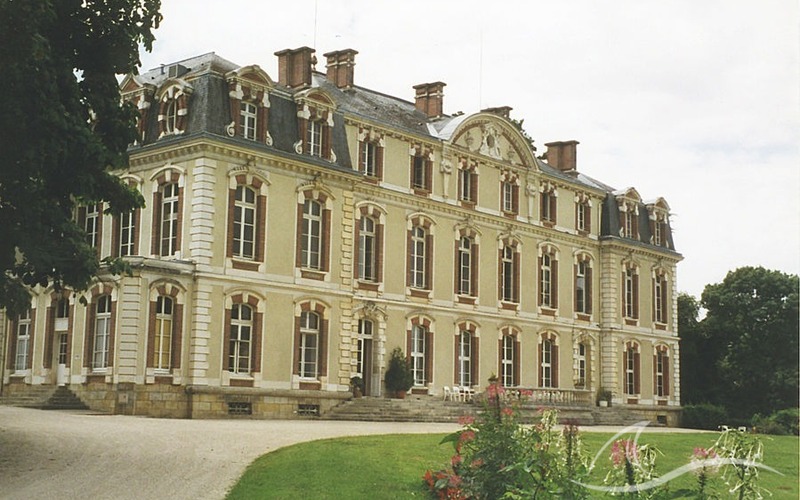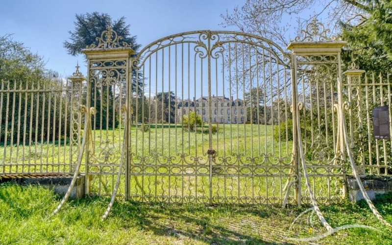 Château principal : bâtiment rectangulaire du XVIIIe siècle, jardin paysager à l’avant, bois à l’arrière