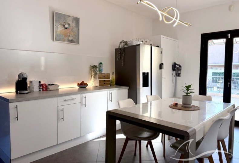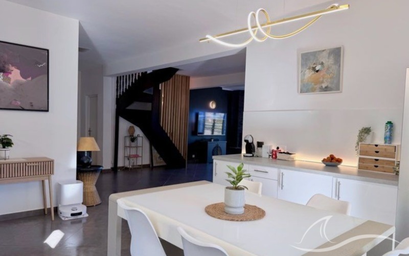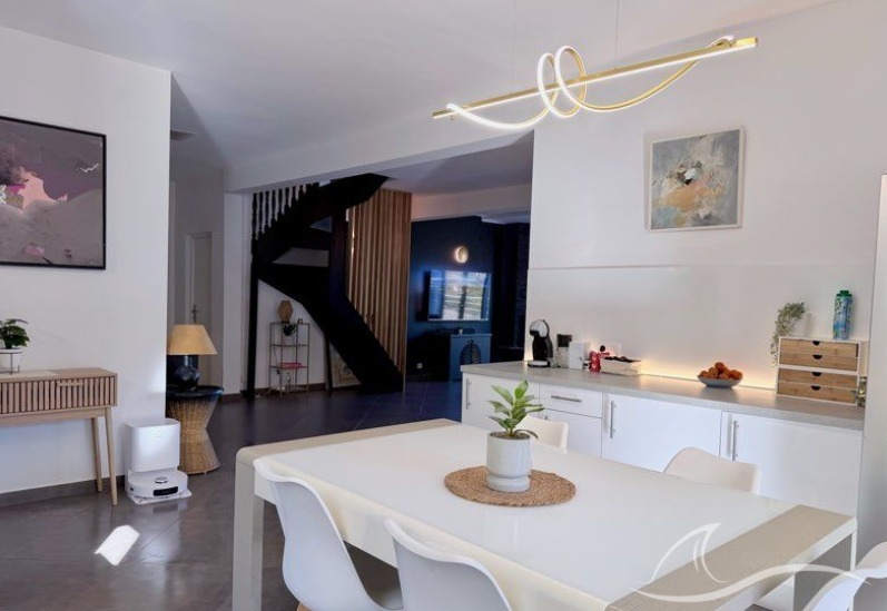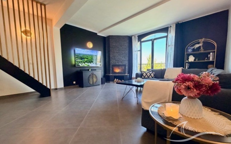 Vaste espace de vie de plus de 50 m² avec cuisine contemporaine et salon doté d’une cheminée insert