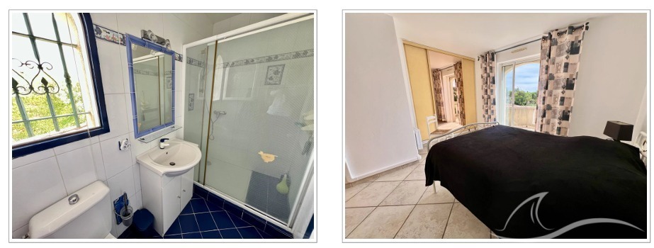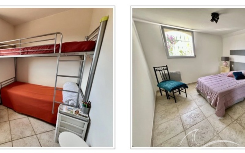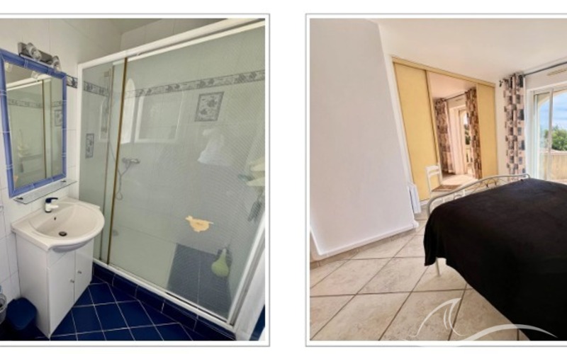 Étage : une chambre avec terrasse et aperçu mer, une chambre d'appoint et une salle d'eau avec W.C.
