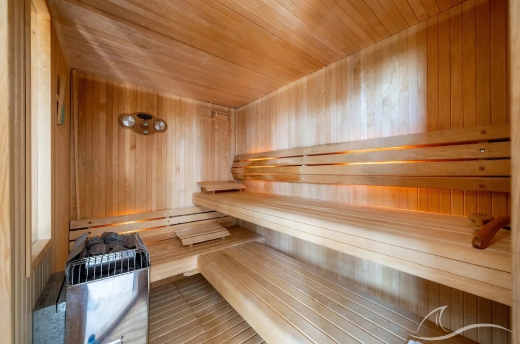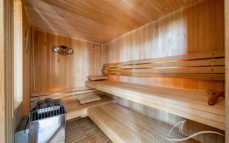 Un espace sauna s’ouvre sur une terrasse où se trouve le jacuzzi,