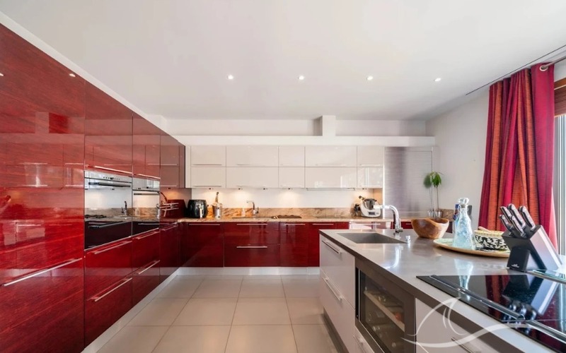 Le double salon séjour et la cuisine prolongent leurs lignes vers une immense terrasse panoramique d’un côté, et une terrasse